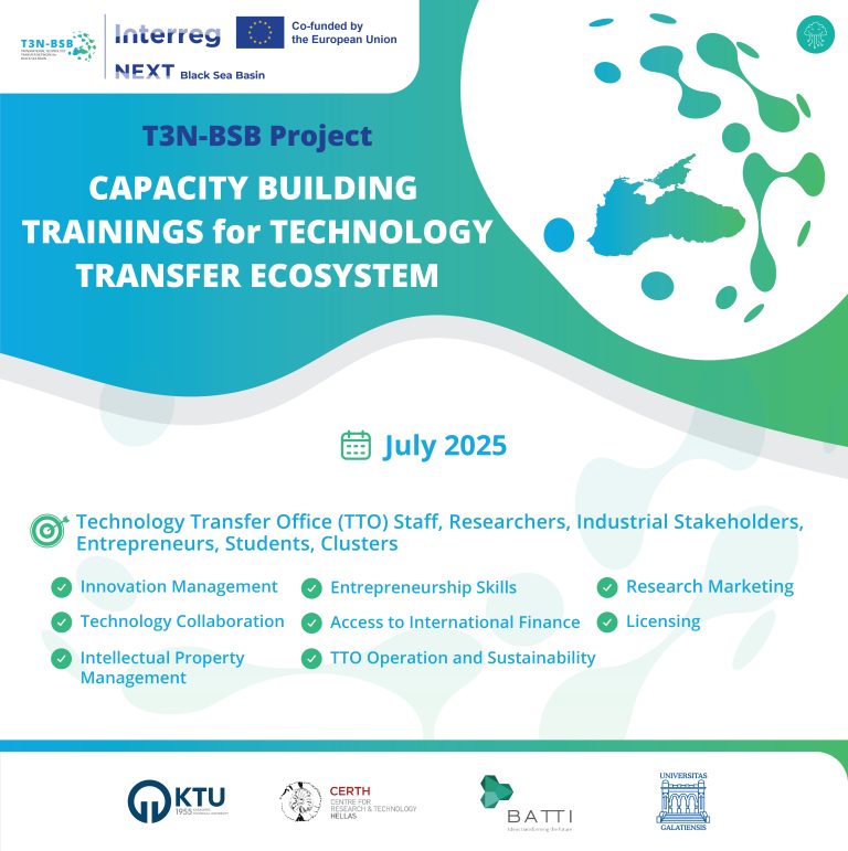 Within the scope of the Transnational Technology Transfer Network for the Black Sea Basin (T3N-BSB) project, supported by the Interreg VI-B NEXT Black Sea Basin Programme, the “Technology Transfer Ecosystem Capacity Building Trainings” organized with the contributions of project partners have been successfully completed.